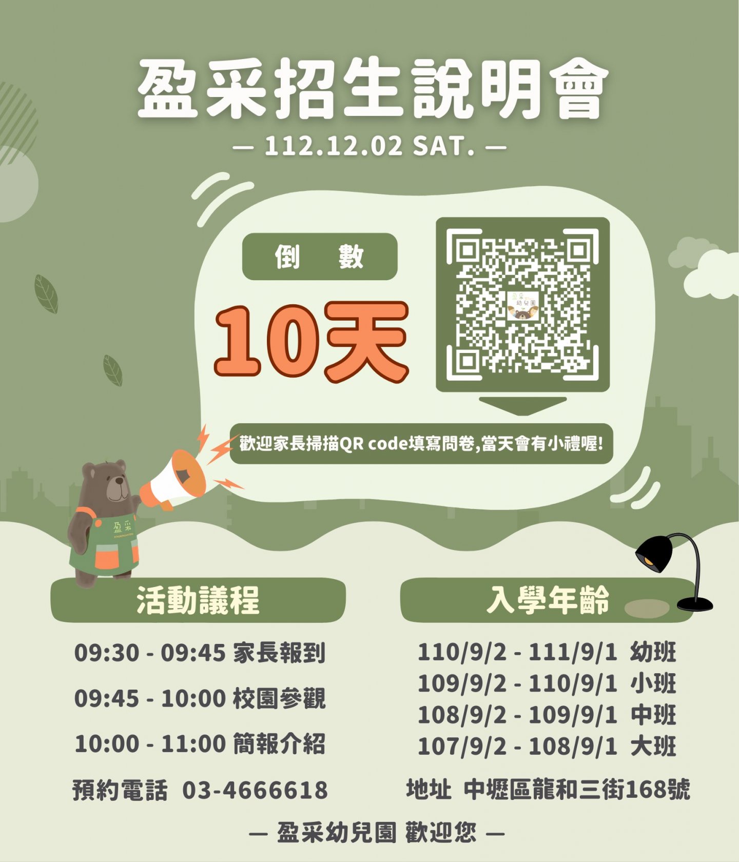 |新生招生說明會| 讓盈采可以了解家長的需求, 歡迎你們一起填起問卷, 讓我們更加認識你們。 問卷網址: https://www.surveycake.com/s/WXa3L 12/2(六)盈采與家長有約, 誠摯的邀請各位家長參與。 #探究式主題課程 #最有趣的教育方針 #環境優美的盈采校園