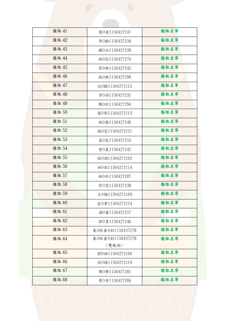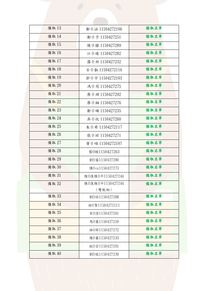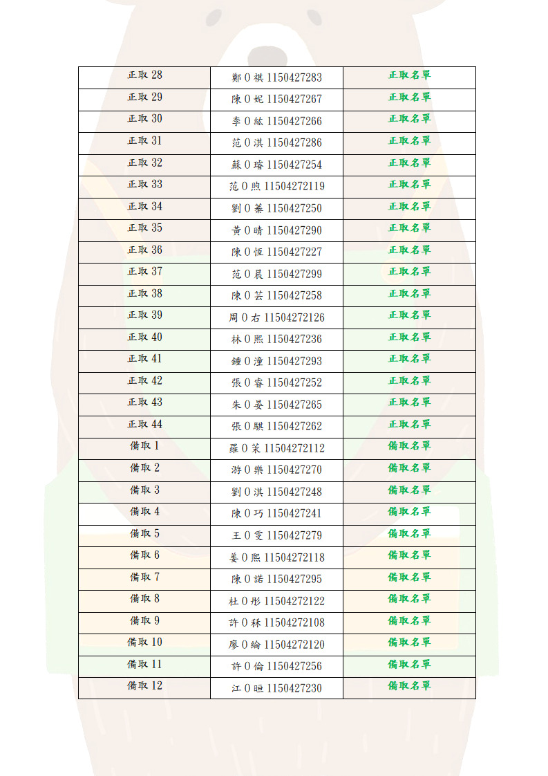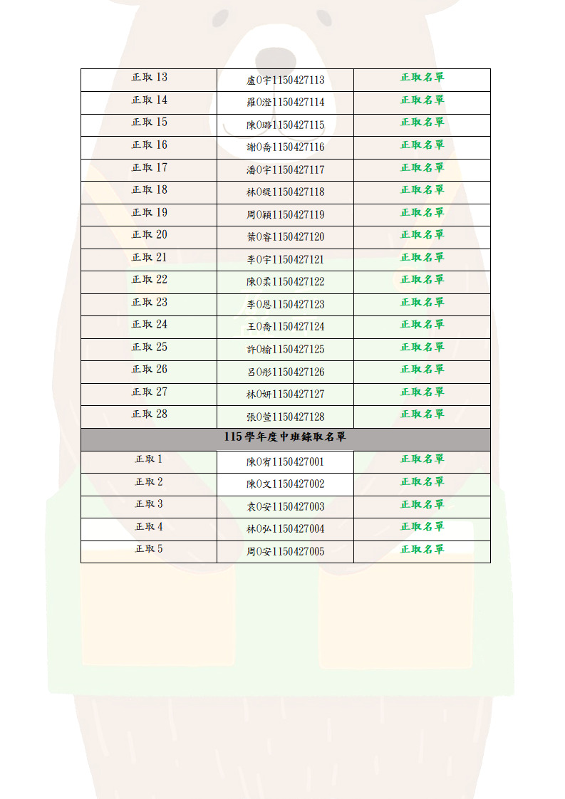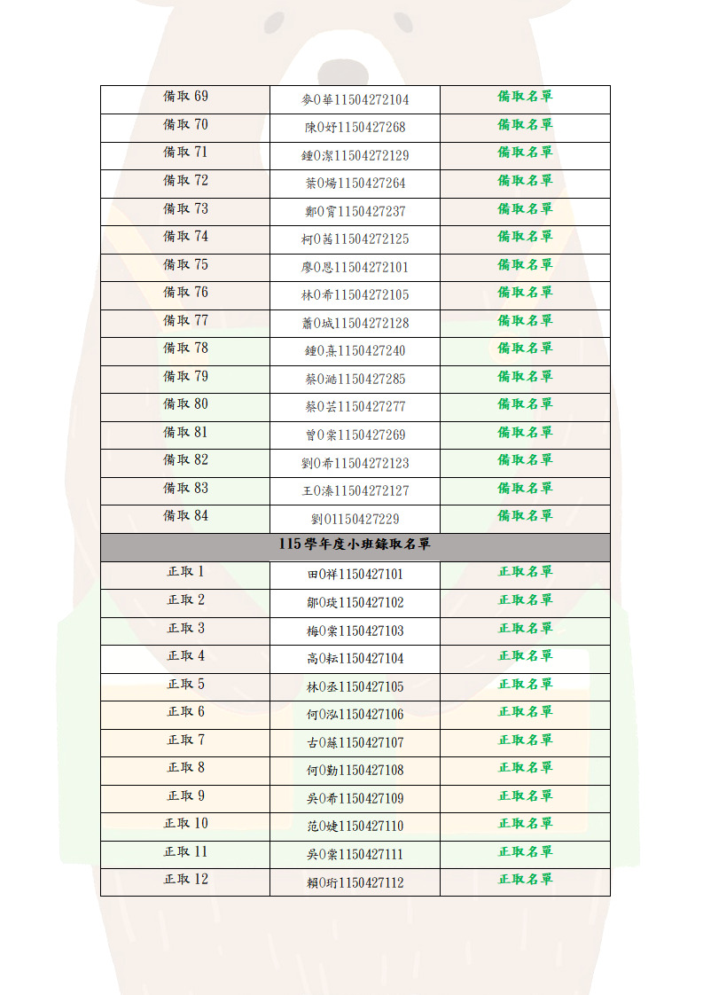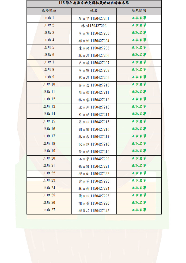 各位家長您好: 【115學年度新生登記錄取名單公告】 📌 報到時間: 4月28日(二)至4月30日(四) 上午 9:00-12:00 📌 報到說明: 正取生將以簡訊通知家長,請留意手機訊息,並務必於指定日期與時間完成報到。 📌 注意事項: 正取生如未於4/30報到成功,請來電告知盈采行政,感謝 正取生如於 5月15日(五)前未完成報到,將視同放棄資格, 本園將依序通知備取生遞補。 📞 如有任何問題,歡迎來電洽詢:03-4666618